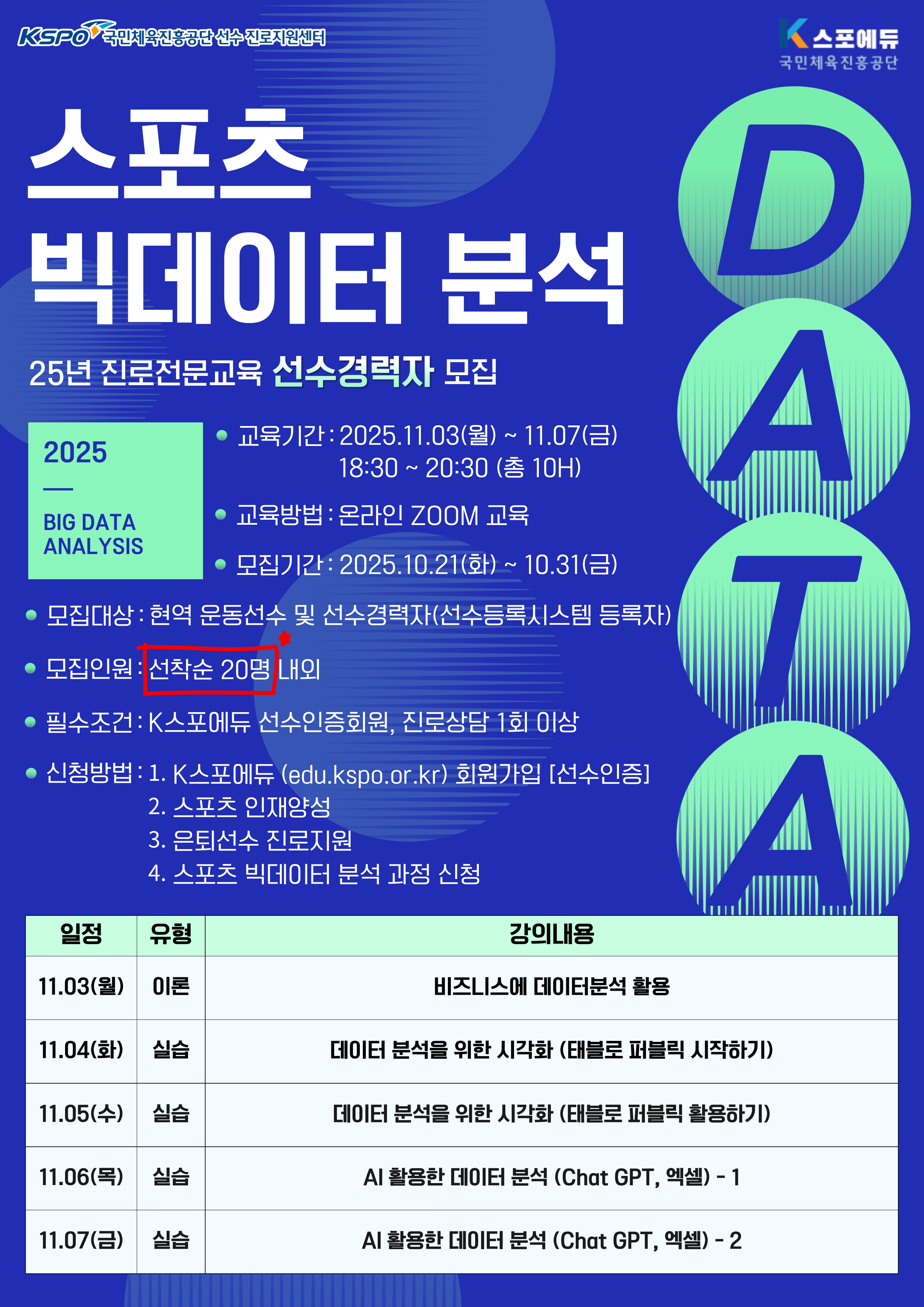 국민체육진흥공단에서는 선수경력자(현역 및 은퇴)들의 진로지원을 위하여 다양한 교육과정을 운영하고 있습니다. 관련하여 선수경력자를 대상으로 「2025년 11월 진로역량교육」을 아래와 같이 운영하오니,