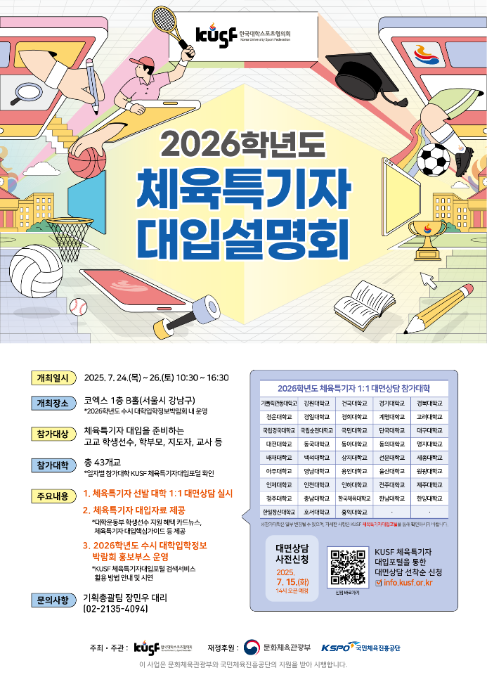 한국대학스포츠협의회에서 공정한 체육특기자 입시문화를 조성하고자「2026학년도 KUSF 체육특기자대입포털」 운영 및 「2026학년도 체육특기자 대입설명회」개최를 안내드리오니, 고교 학생선수들의 많은 참여 바랍니다.